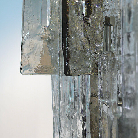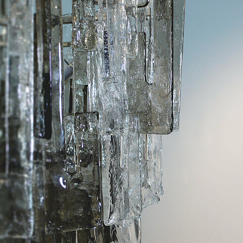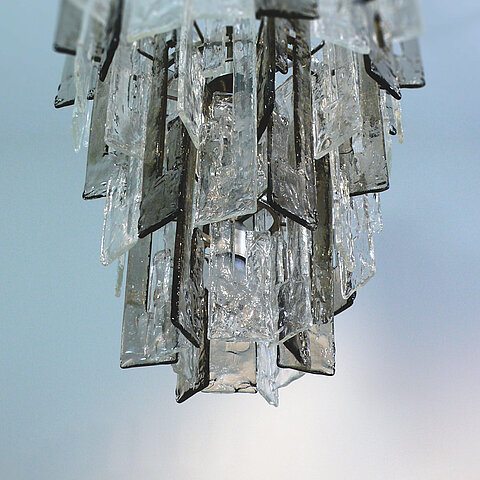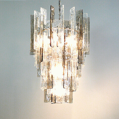 Crown-shaped 5-tiered chandelier designed by Carlo Nason for Mazzega. Made of more than 70 interlocking C-shaped clear and grey elements. Iced glass is a leitmotif of Carlo Nason. It shades the light and creates different tones of colour and degrees of transparency. The frame is made of chromed metal and accomodates 11 E14 light bulbs and one E27.