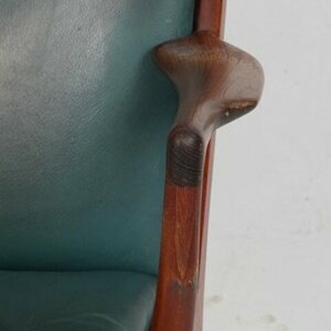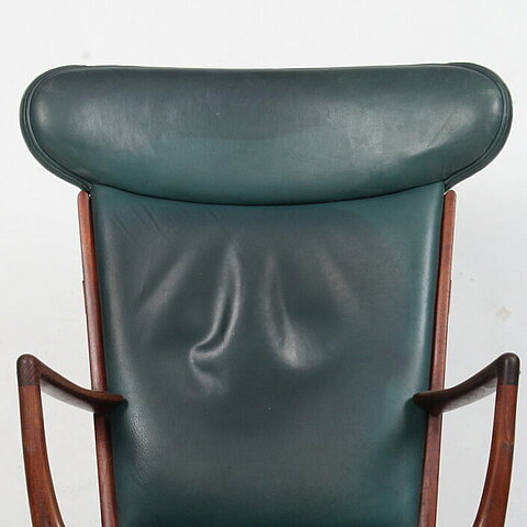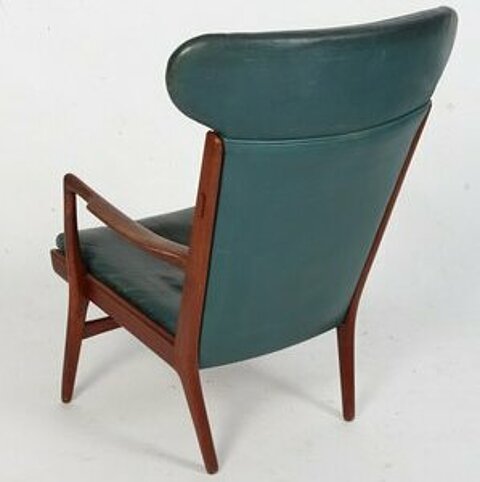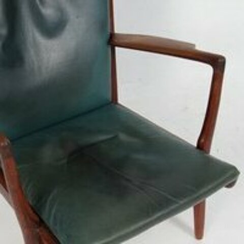 Fantastic armchair with solid lacquered teak frame, upholstered in green leather, designed by Hans Wegner for AP-Stolen in 1951.