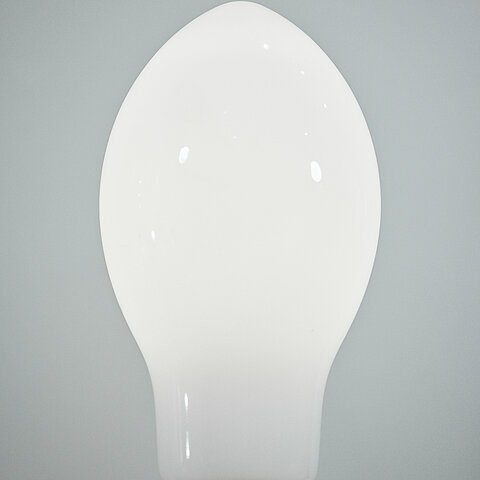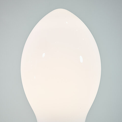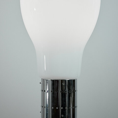 Opaline murano glass floor lamp made of two separate parts in the shape of a lipstick. The top and bottom sections are connected by a beld made of chromed metal and are each lit by a E27 light fitting.