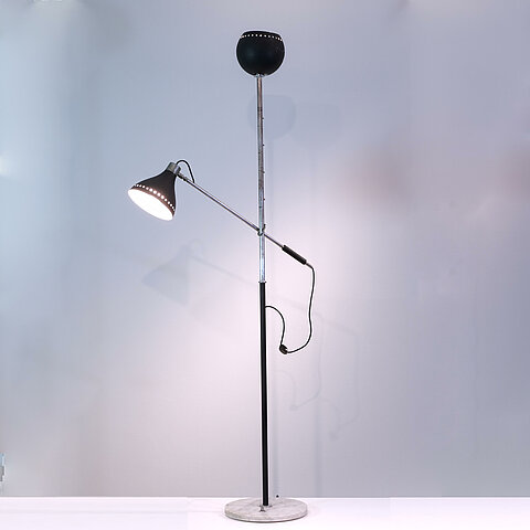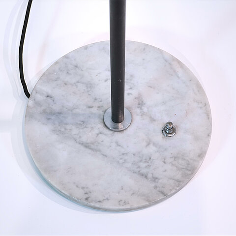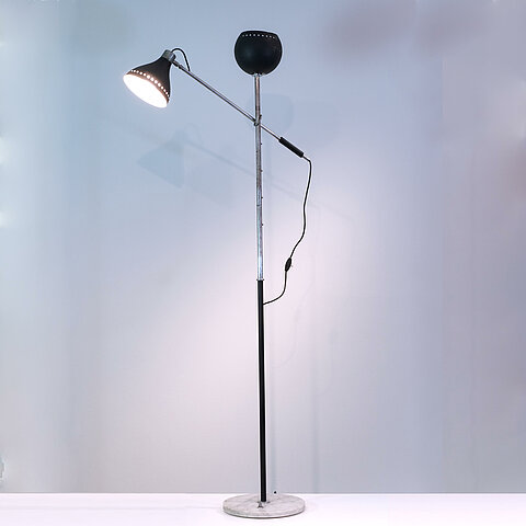 Italian floor lamp with unique height-adjustable arm made of chrome-plated and lacquered metal, aluminium and a marble base. It resembles the design of Stilux Milano. The two metal shades accomodate one E27 bulb and can be light separately or together.