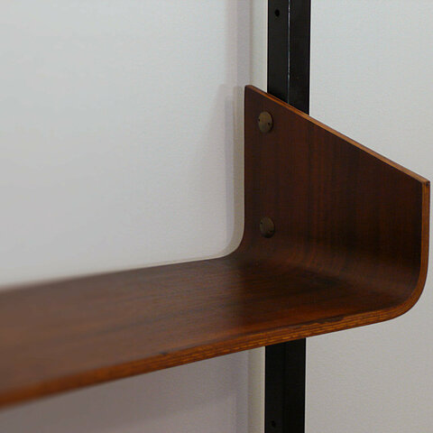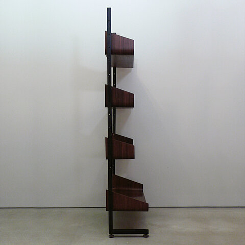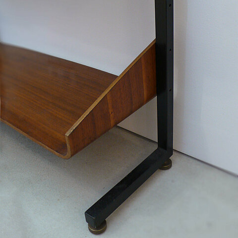 Beautiful freestandig shelving unit made of lacquered metal with adjustable feet and screws in brass. The four shelving floors are made of rosewood textured plywood. Simply stunning!