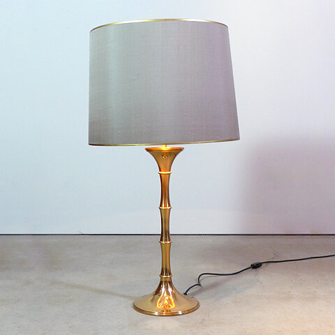 Table lamp by Ingo Maurer for Design M Munich, Germany 1970s. Polished metal with round shade and golden edging.