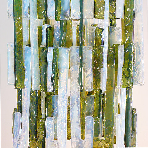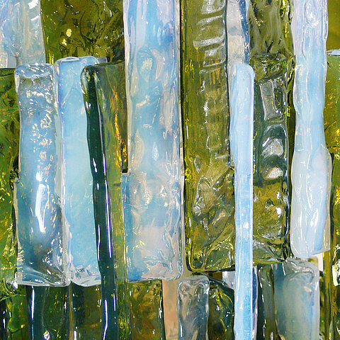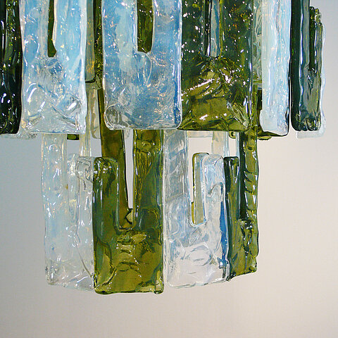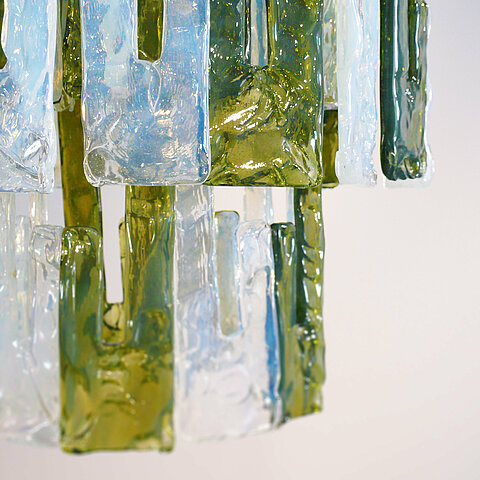 Remarkable chandelier designed by Carlo Nason for Mazzega. Made of more than 50 interlocking C-shaped green and opal elements. Iced glass is a leitmotif of Carlo Nason. It shades the light and creates different tones of colour and degrees of transparency. The frame is made of chromed metal and accomodates 5 light bulbs.