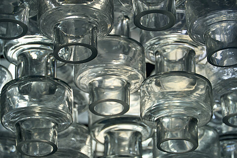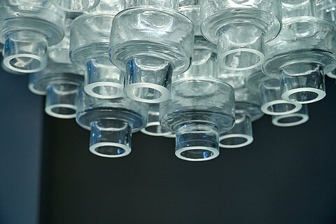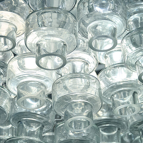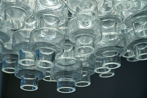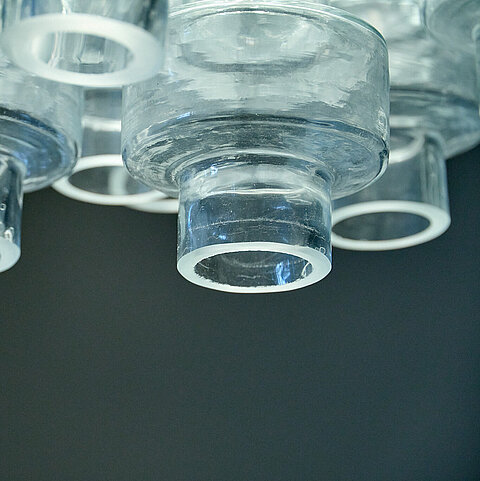 Large Manubri Murano glass chandelier fitted with over 100 clear glass elements. Each component is hand-blown individually to create this organic and spectacular fixture. We couldn’t resist the clear color, so delicate and classic, underlining the futuristic feel of the piece. It's a recent production made by one of the leading manufacturers in Murano using a mould and design dating back to the 1970s.