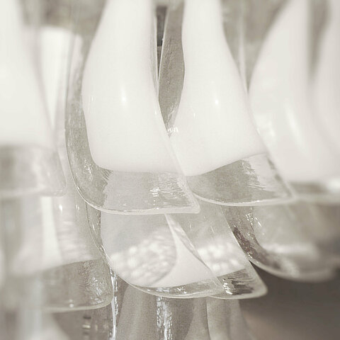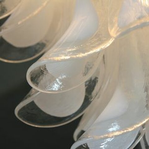 Large Murano 8-tier glass chandelier with over 140 pieces of 'horse shoe' glass with white coloration. Chromed steel frame construction with 12 light fittings.