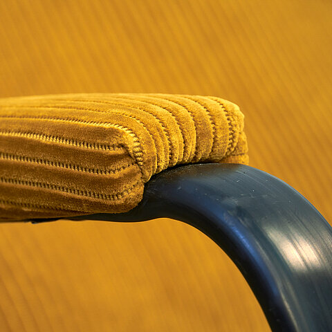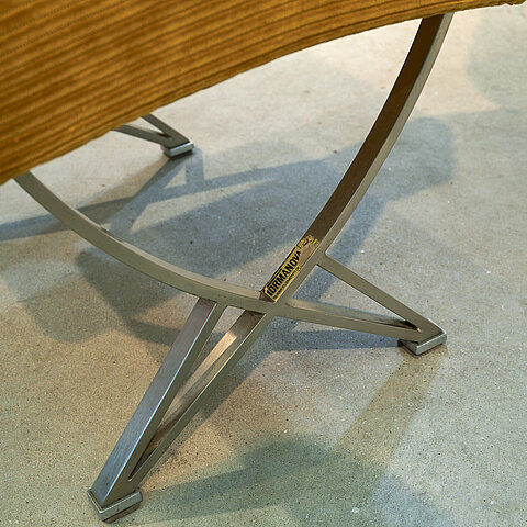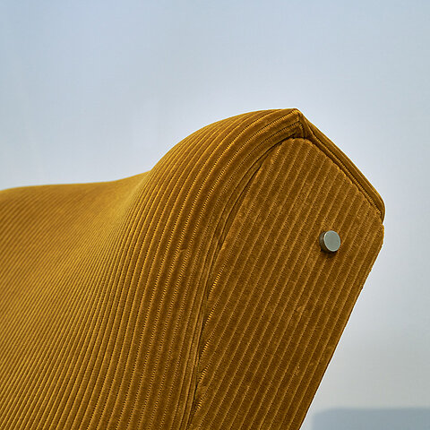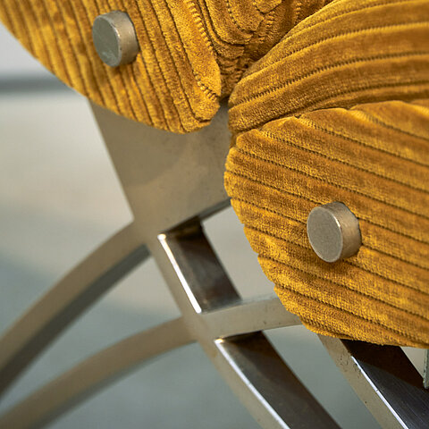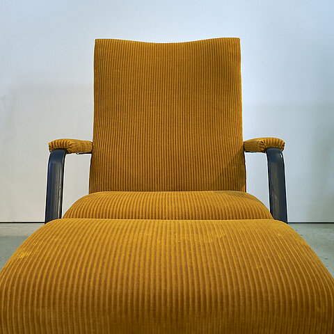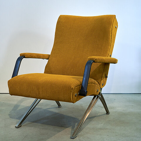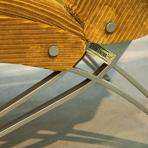 Rare set of MILLY recliner armchair with footrest by Gianni Moscatelli, reupholstered with a luxurious mustard coloured wide ribbed velvet, chrome metal base. Both items are marked "Formanova". Wonderful example of late 60s to early 70s mid-century design!