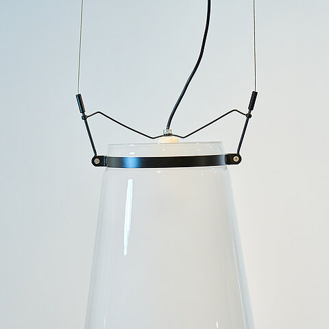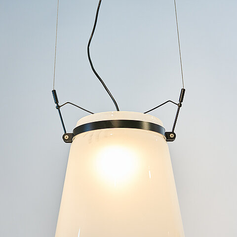 Rare ceiling light manufactured by Luceplan in Italy in the 1980s. Made of lacquered metal and frosted glass. Cleverly designed fully detachable metal fitting that holds a simple large-sized glass cylinder. Blends in beautifully with a variety of interior settings. Height is easily adjustable.