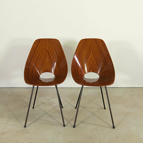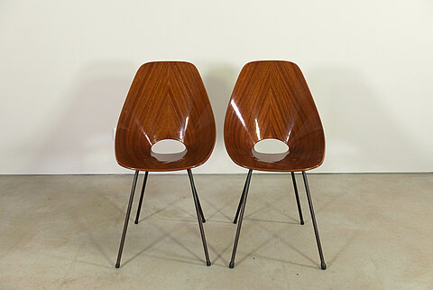 Beautiful pair of "Medea" chairs, designed by Vittorio Nobili in 1955. Moulded plywood (rosewood, shiney varnish) and metal base, produced by Fratelli Tagliabue. We have a second pair (matt varnish) in stock.