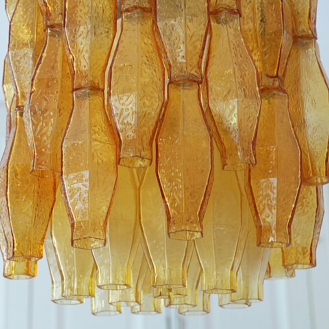 Stunning vintage Murano glass poliedri or polyhedral chandelier consisting of amber coloured polyhedral glass elements hung on a silver metal frame. The frame takes 6 x E14 bulbs.