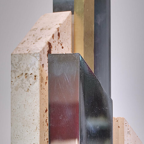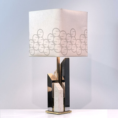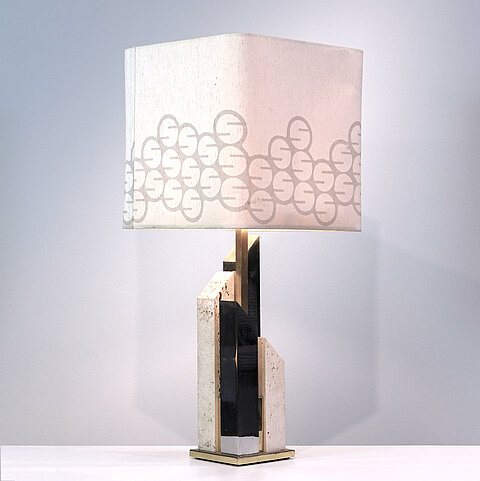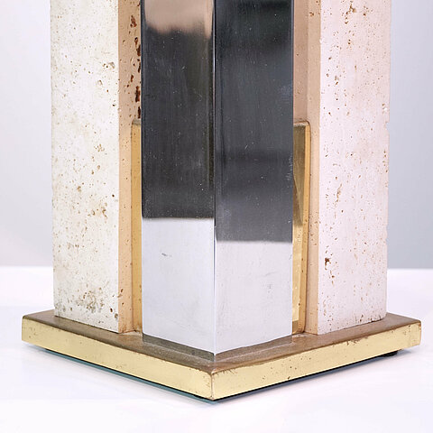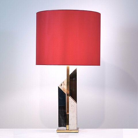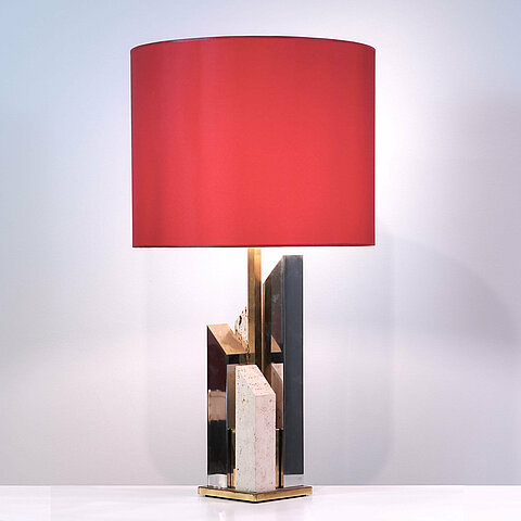 Large table / floor lamp by Gaetano Sciolari, Italy 1970s. Construction made of nickel-plated metal, travertin und brass, round shade, marked "Sciolari Roma" at the bottom. It comes with the original square lamp shade as well as a new round one in stunning red. Wonderful eye-catcher!