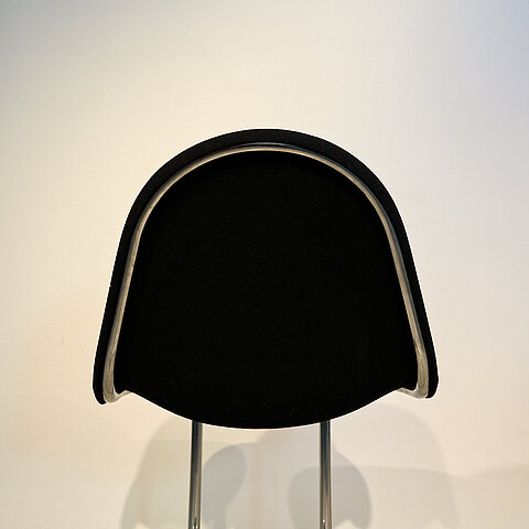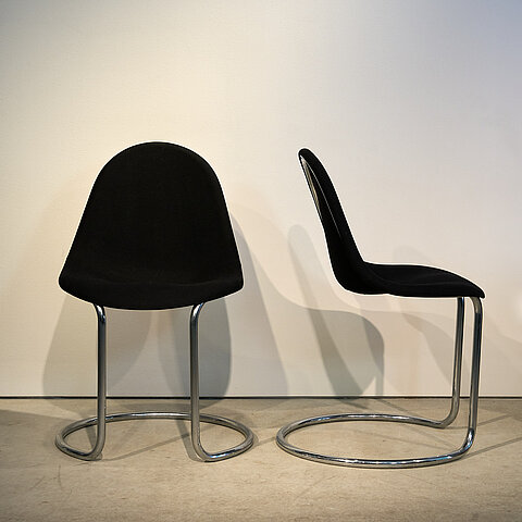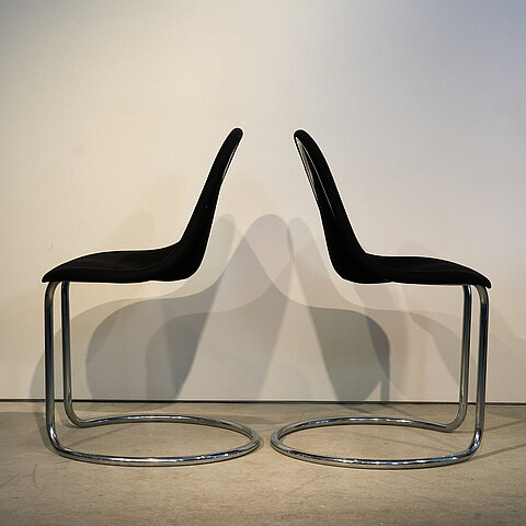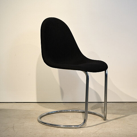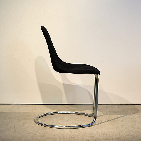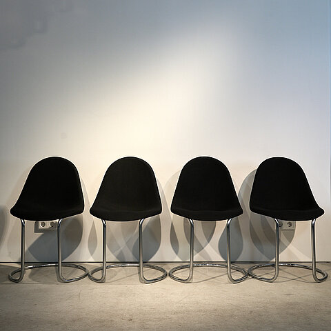 Set of four black leather Maia chairs by Giotto Stoppino for Bernini. The chairs feature a moulded shell with a textile cover. The organic shaped shell is attached to a chromed tubular steel frame which is cantilivered.