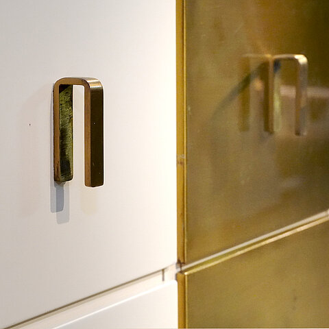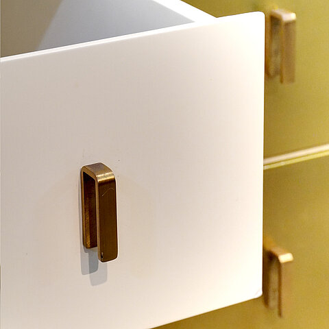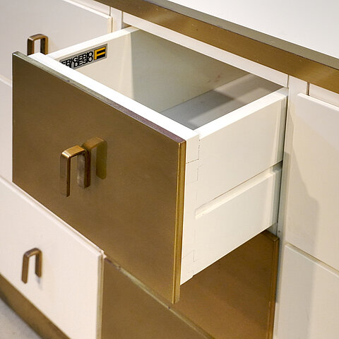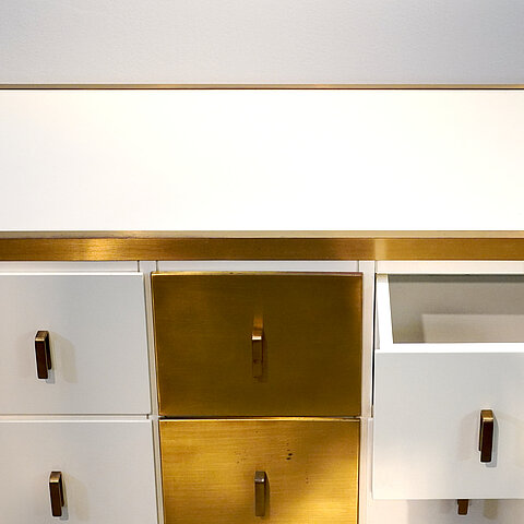 A unique and very elegant cabinet with drawers designed by Luciano Frigerio for Frigerio di Desio, high quality of execution for the uniqueness of the design and choice of materials (wood and brass), entirely handcrafted in wood, the surround completely lacquered in white, the back finished as well so that this piece can be used free-standing. Simply an outstanding piece!