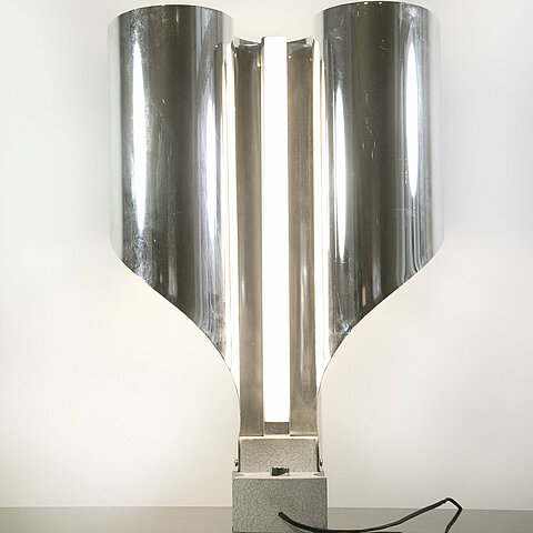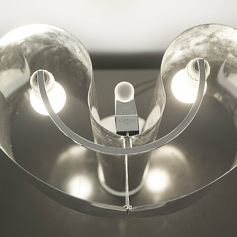 Amazing table lamp for Stilnovo, futuristic construction made of partly chromed metal, marked "Stilnovo Italy".