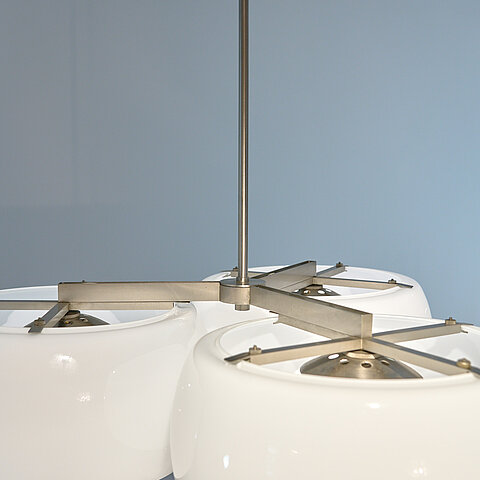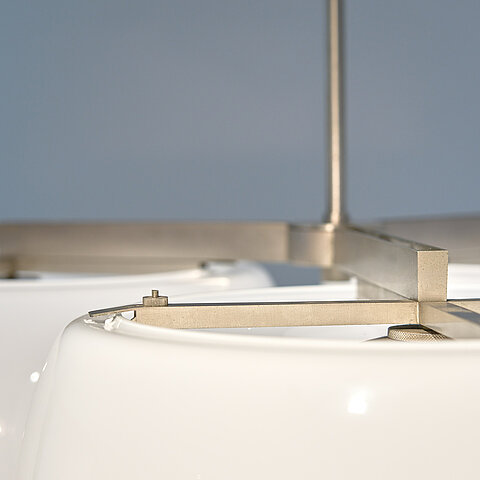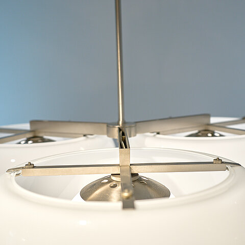 The "Triclinio" ceiling lamp, designed by Vico Magistretti, Italy 1961. Three large double diffuser glass shades, opal glass and brushed metal frame. Produced by Artemide, Italy. Rare to come by! Height including the metal rod 111 cm.
