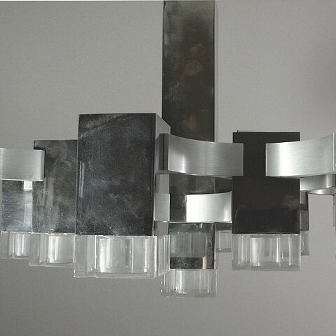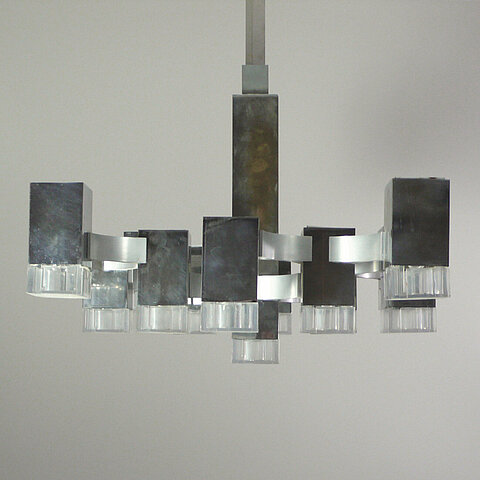 Large cubic ceiling fixture designed by Gaetano Sciolari made of plated steel with 13 lights that are connected by arched, brushed aluminum arms. Each light has a single candelabra socket and a molded plastic diffuser.