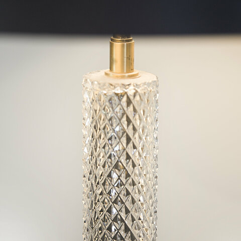 Decorative pair of table lamps made of glass and brass coloured metal: classic design that blends in with various interior design styles. The continuous multi-facetted prisms are obtained by "freehand" shaping of the glass - a method that was invented by Ercole Barovier in 1938 and patented by Barovier & Toso.