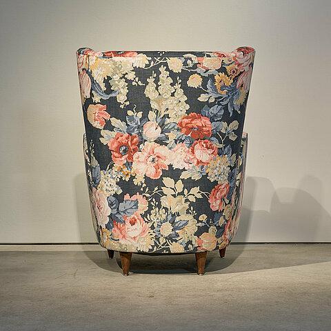 Stunning pair of compact armchairs in the manner of Gio Ponti covered in luxurious floral linen fabric. Quite suitable for smaller spaces while making a statement! Spot on trend!
