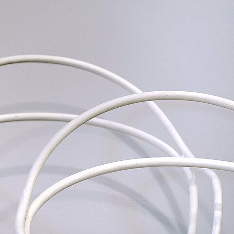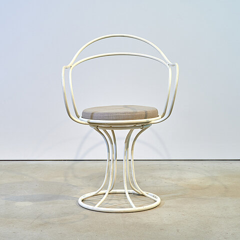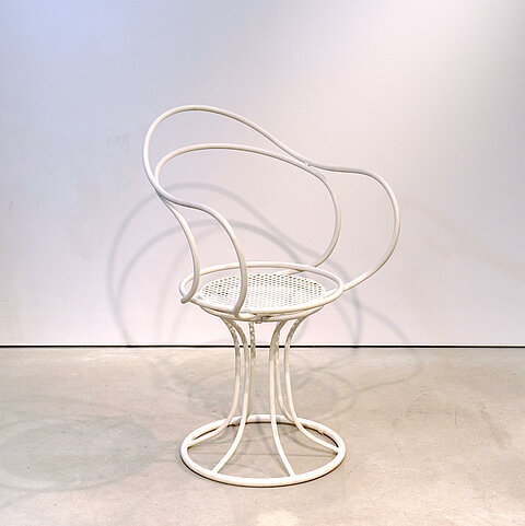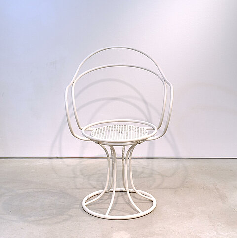 Set of four chairs made of lacquered steel base and woven steel seat. It comes with 4 linen covered bespoke cushions.