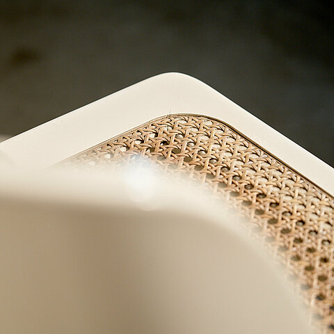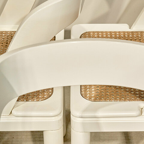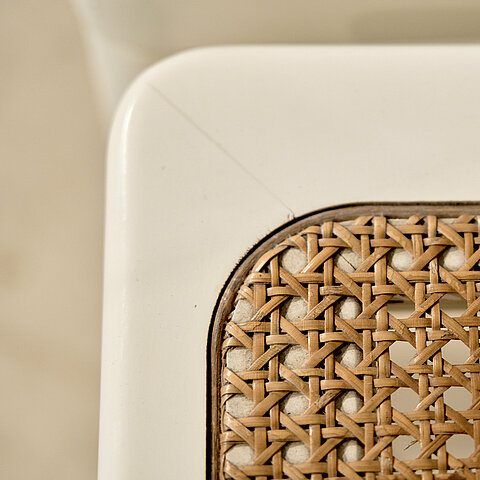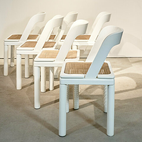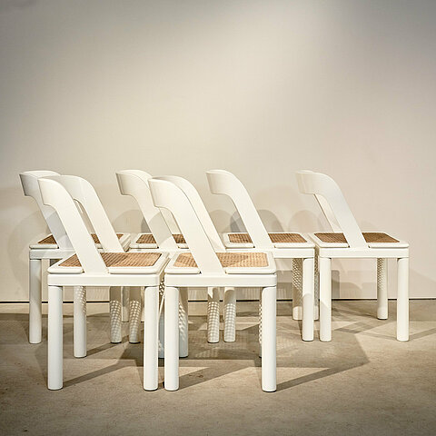 Scarpa meets Thonet! Shapely yet sturdy set of six identical Italian dining chairs made of lacquered oak wood with wicker cane seat. We have not managed to find any information regarding branding or designer despite the set originating from Italy and were made in the 60s. Contemporaries are by Willy Rizzo, Gianfranco Frattini and Afra & Tobia Scarpa. The set has been fully refurbished and benefits from a beautiful patina. Last but not least, they are extremely comfortable.