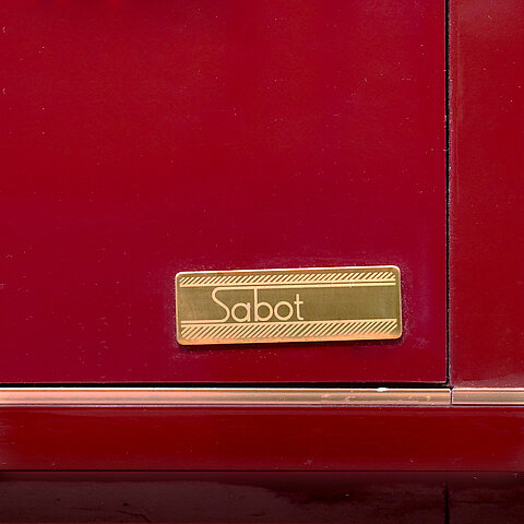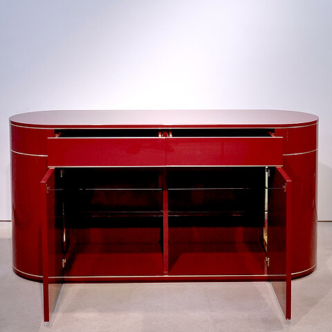 Oval red 2-door and 2-draw sideboard / bar cabinet in the manner of Willy Rizzo manufactured by Sabot made of lacquered wood, glass and brass detailing. Inside is partly lined with mirrored glass and two removable glass shelves. Exceptionally rare find!